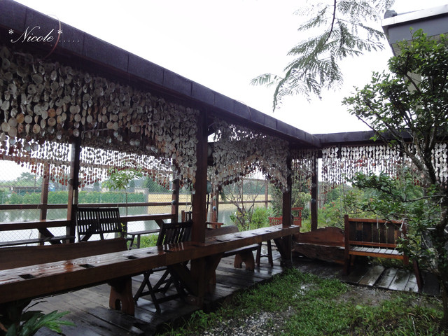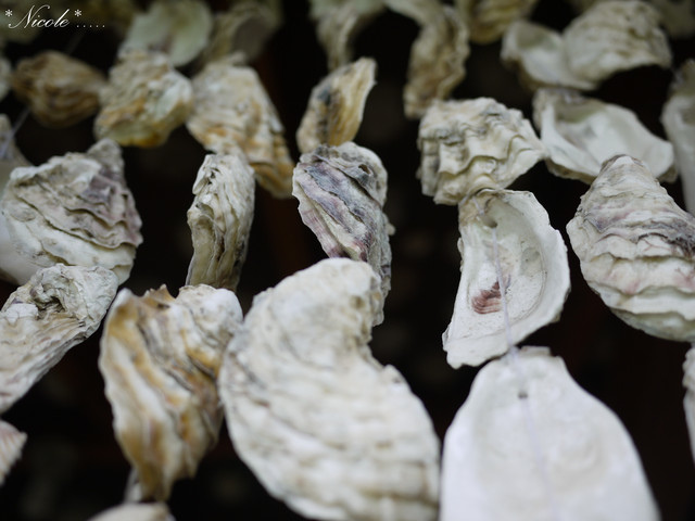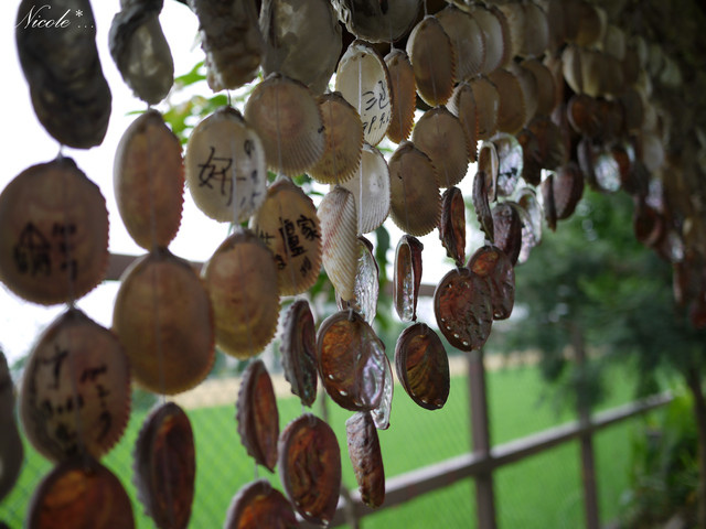 涼亭四周掛起整串的貝殼與蚵殼