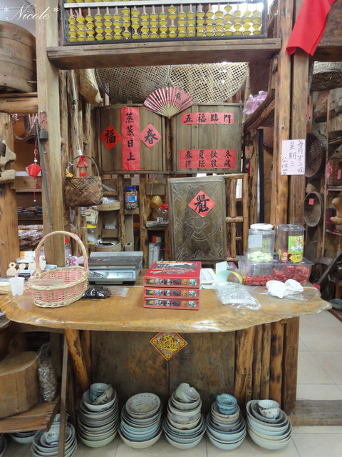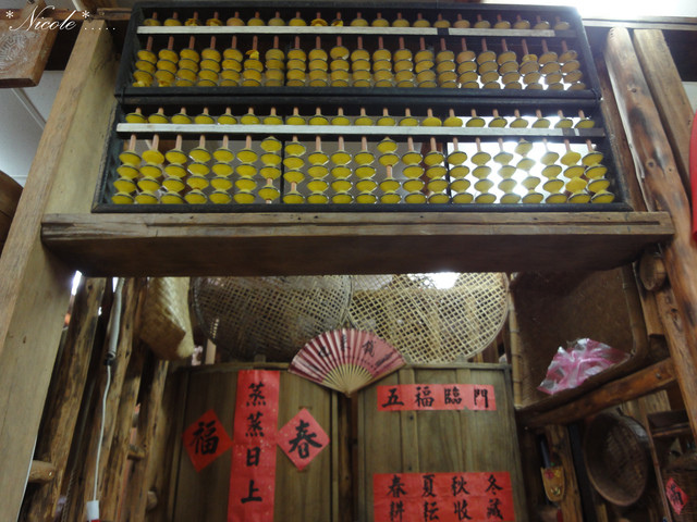 櫃檯上擺了個大算盤 桂台下擺了許多古董碗盤~